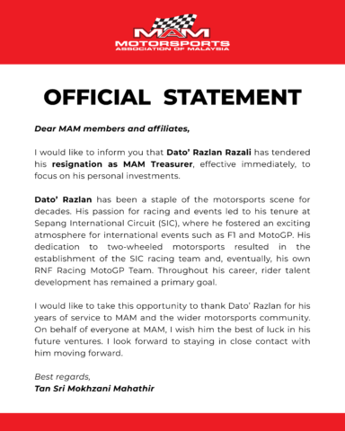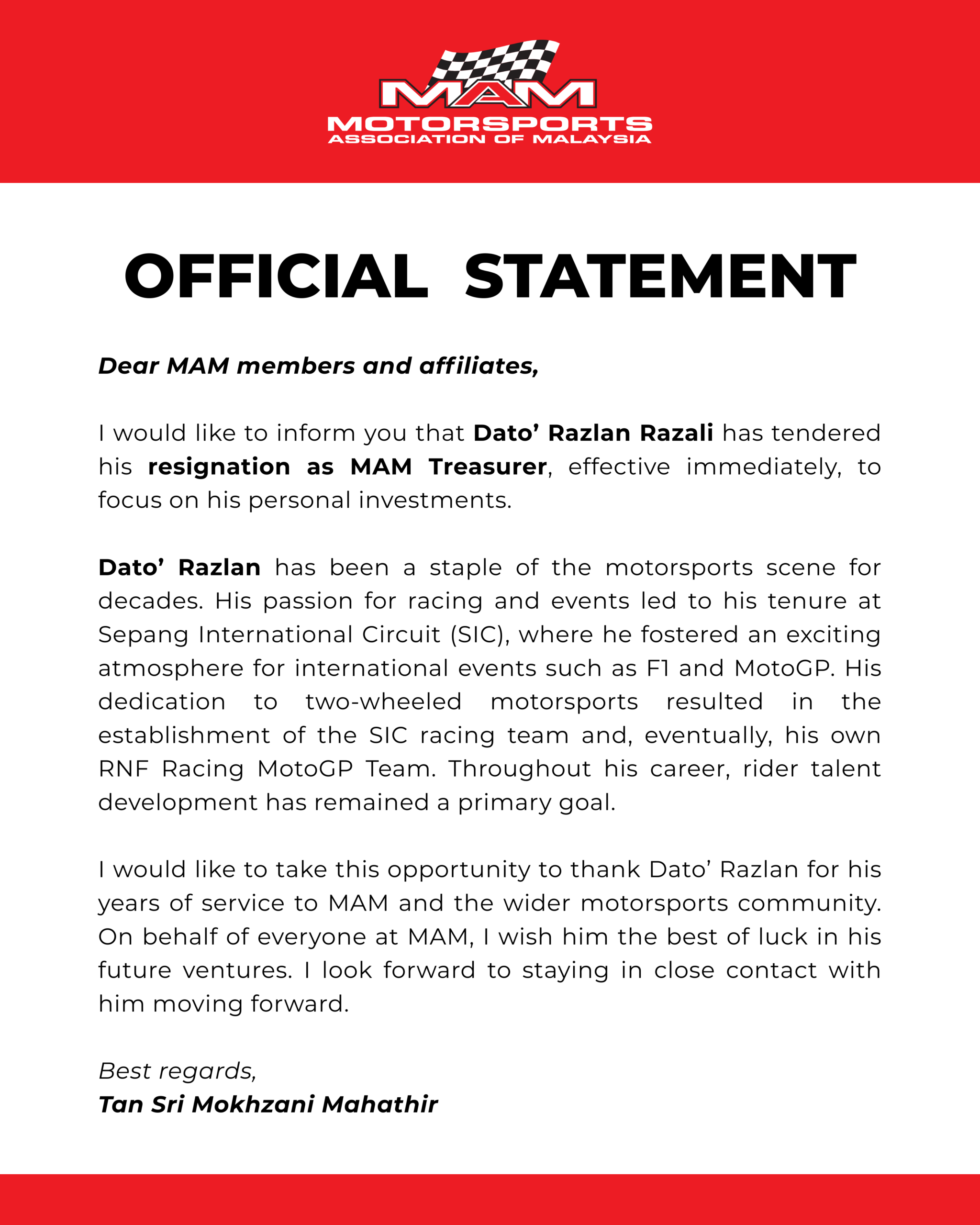 I would like to take this opportunity to thank Dato’ Razlan for his years of service to MAM and the wider motorsports community.